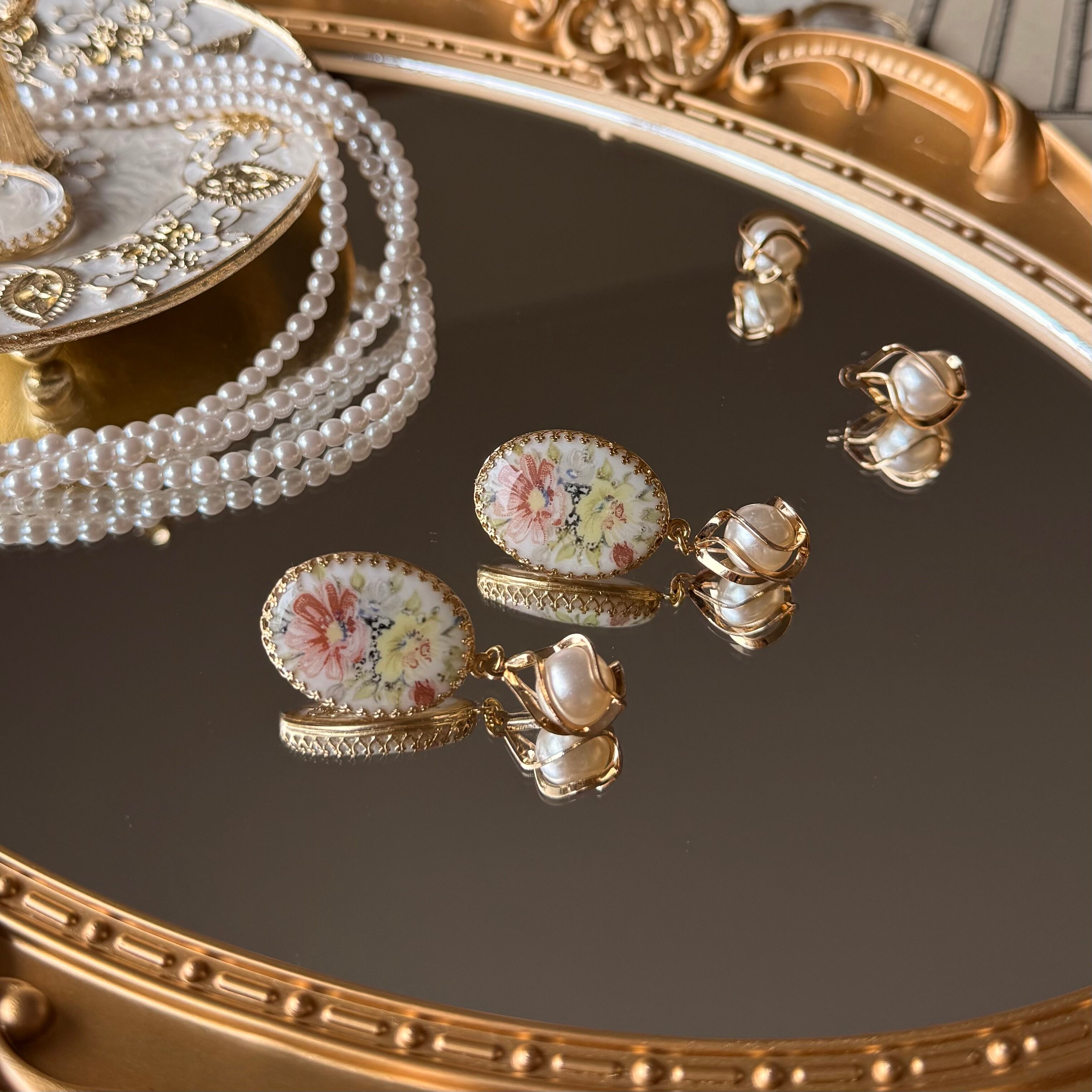 Fleur de mémoire(フルール・ド・メモワール)は、真鍮の台座に美しい花柄のカメオが施されたピアスです。ピンク色の花をベースにしたカメオは、優雅さを引き立ててくれます。さらに、揺れるパールが動くたびにおしゃれ感をプラスし、あなたのスタイルを華やかに彩ります。
